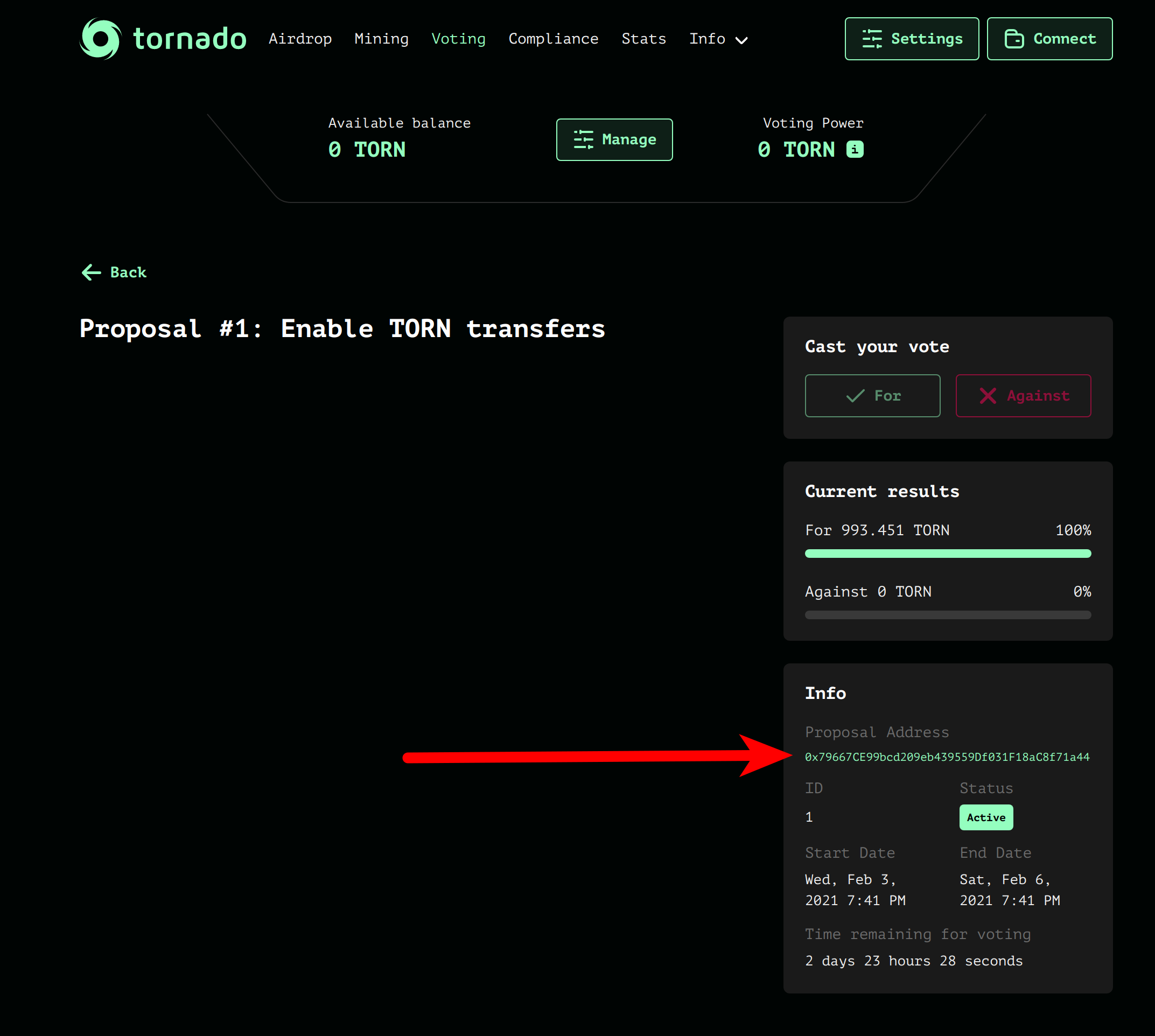 The proposal voting period is 5 days, quorum (minimum amount of votes required to be valid) is 25,000 TORN. If the proposal fails to reach quorum it is invalid and will not execute even with a winning majority.